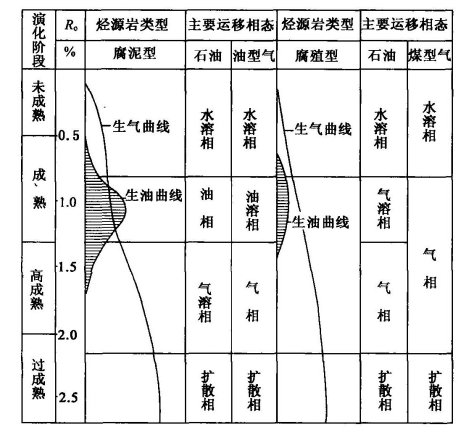 对于富含Ⅰ、Ⅱ型干酪根的腐泥型烃源岩来说,在埋藏较浅的未成熟阶段,由于石油还未大量生成而地层孔隙度又较大,此时烃源岩中含油饱和度很低,主要是水相运移;进入大量生油的成熟阶段后,一方面生油量大大增加,另一方面孔隙度又较小,烃源岩中的含油饱和度变大以致超过临界运移饱和度而发生连续油相运移;随着烃源岩进一步埋深,在较高温度下,演化进入高成熟的湿气阶段,此时石油主要是气溶相(包括凝析气和轻质油)运移;再往深处石油发生热裂解产生大量甲烷气体,此时除在较大裂隙和较大孔喉通道中可以发生气相(包括凝析气、超临界气)运移外,由于地层已相当致密,主要是扩散相运移。所以,腐泥型烃源岩石油初次运移主要相态随埋深的演变主要是水溶相→油相→气溶相→扩散相。