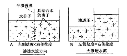 渗透作用是自然界普遍存在的重要现象,它是指水由盐度低的一侧通过半渗透膜向盐度高的一侧运移的作用。众所周知,溶液的盐度越高蒸气压就越低。水的活动性也越低;反之则水的活动性就越高。因此水体由活动性高的地方流向活动性低的地方,形成渗透流。这种作用的大小一般用渗透压力来衡量(图6-11)。我们也可以说盐度低渗透压高,盐度高则渗透压低。因此渗透作用也就是低盐度溶液中的水(溶剂),在渗透压差的作用下通过半渗透膜向高盐度方向运移,直到盐度差消失为止,可见这种作用是由盐度差引起的。