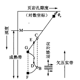 在正常压实与欠压实同时存在的混合压实带中,地层间出现流体压力差和压力封隔层。正常压实层中流体压力较欠压实层中低,流体从欠压实地层向正常压实地层中运移,同时异常高压的欠压实层本身也就成为流体运移的封隔层。这样在混合压实带中,处于两个欠压实层之间的正常压实层就成为流体汇聚的排液区(图6-10)。