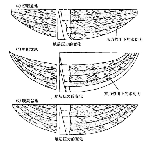 以上两种水动力一般是随盆地演化先后产生(图6-22),并可在地层剖面上呈旋回式出现。