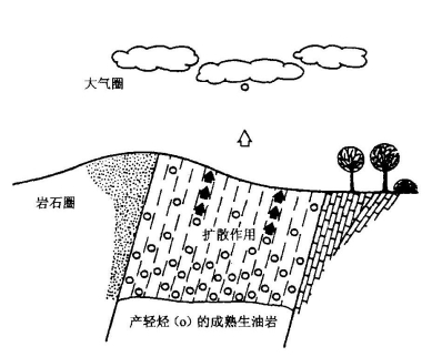 烃类只要存在着浓度差,烃类的分子扩散就可以在任何时空中发生,而地下烃源岩生成的烃类所形成的原始浓度就是进行分子扩散的源头。因此轻烃的扩散不仅可以在烃源岩中发生,而且接着就可在运载层中进行直到地表进入大气圈(图6-25),可以说这是自然界中一个没有停顿的连续过程。可见,在初次和二次运移过程中分子扩散都是一种动力,尤其对气态烃更为明显和重要。虽然分子扩散在二次运移中相对于浮力、水动力、异常压力只是一种次要的动力,其速率比油气的渗流小几个数量级,但在某些地质条件下,特别是在水动力梯度很微弱的致密地层中,分子扩散就成为二次运移的主要动力和方式,在非常规的深盆气、煤层气、透镜体中油气的运聚成藏过程中起着重要的作用。