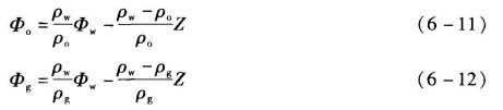 对于地下孔隙水中呈连续烃相的油气,二次运移过程中的渗流大多是油、气、水三相渗流,并简化为油-水或气-水的两相渗流。如果不考虑毛细管力的作用,水动力对油气运移有很大影响。多相流体渗流最为合理和方便的表述是用水势描述油、气势。在第四章现代圈闭概念中已经论述。即: