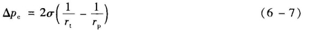上述章节讨论的毛细管压力是单根毛细管,一端完全是油(气)、另一端完全是水的情况。实际上,此时所产生的毛细管压力并不能代表油气在地下岩石中运移的阻力。因为地下岩石都是由不同孔径的三维空间介质所组成,不是孔径相同的单一毛细管。进入储集岩中的油气,在水介质中运移总是被水所包围,当它们通过两端孔径不同的孔喉时,油气所受到的毛细管阻力实际上是两端不同孔径的毛细管压力差: