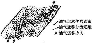 由于储集层的非均质性,油气的二次运移不可能在整个运载层中发生,只可能在非均质储集层中沿孔渗性最好、毛细管阻力最小的通道运移。李明诚(1989)提出了有效通道空间概念,定义为运载层中真正发生了运移作用的通道。油气首先进入有效通道空间,沿油气优势通道运移(图6-32),它对油气二次运移量和聚集量的研究具有重大意义。