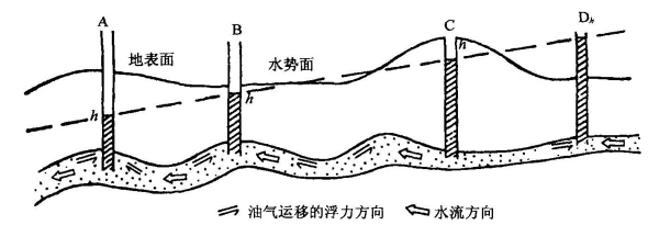 在动水条件下,油、气势取决于水势和高程。由于水势是从供水区向泄水区变小,所以油、气的负势梯度向泄水区偏转。又由于气的密度较油小,所以偏转角度要小一些。总体上油(气)水界面向水流下游方向倾斜,即是此原因。