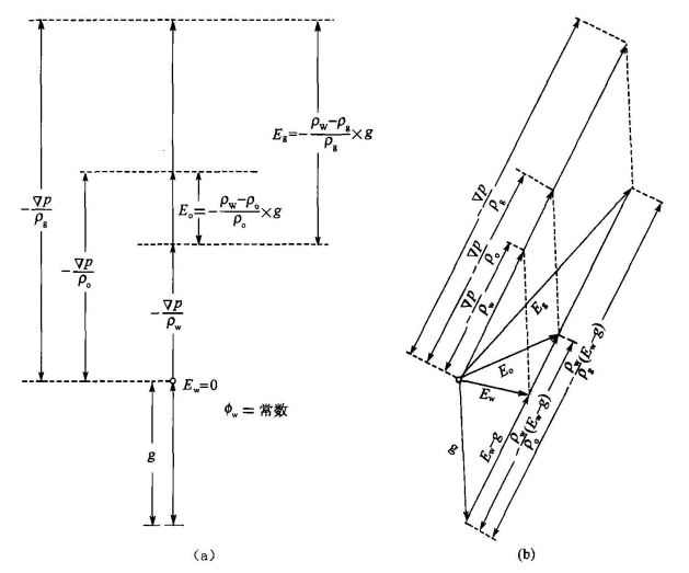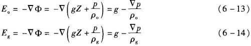 可见,在动水条件下,油气的力场强度包括两部分,前一项相当于作用在单位质量油(气)质点上的水动力,后一项为净浮力。这与前面的受力分析结论完全一致。动水条件下,油、气、水的力场强度相互关系如图6-33(b)所示。虽然重力(g)相同,水压梯度(p)方向也相同,但由于油、气、水密度不相同,结果其合力Ew、Eo、Eg的大小和方向都不相同。