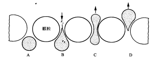 如图6-26所示,假定储集岩由均匀球形颗粒组成,孔隙半径为rp,喉道半径为rt,孔隙空间被水充满,颗粒表面为水所润湿,在静水条件下有一油珠上浮,现分析所受毛细管阻力的情况。图中,A处浮力不足以使油珠表面变形而进入喉道。B处当浮力或其他外力增大时,油珠变形,顶端进入喉道。由于油珠上、下两端孔径不同,两端毛细管压力也不相同,上端毛细管压力pu=2σ/rt指向下,下端毛细管压力pd=2σ/rp指向上,两者方向相反大小不同,因为rt<rp,所以pu>pd,两端毛细管压差指向下,因此对上浮的油珠表现为阻力(pc),其大小可表示为Δpc=pu-pd。C处油珠上下两端界面曲率半径相等,两端毛细管压力也相等。此时毛细管压差等于零,也就是无毛细管阻力,油珠在浮力作用下可以顺利通过。D处由于油珠上端界面曲率半径大于下端界面曲率半径,上端毛细管压力小于下端,毛细管压差的方向与油珠上浮的方向一致,此时毛细管压差非但不是阻力,而且还是驱使油珠上浮的附加动力。