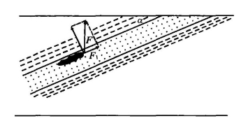 当地层倾斜时(图6-21),浮力将分解成垂直于层面和平行于层面的两个分力。促使单位面积连续油相沿地层上倾方向上浮(运移)的力,等于其浮力沿地层倾斜向上的分力(F1),用公式表示为: