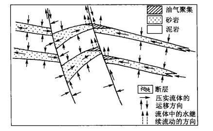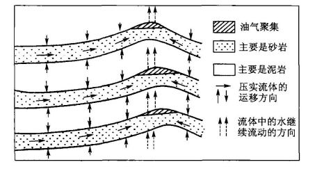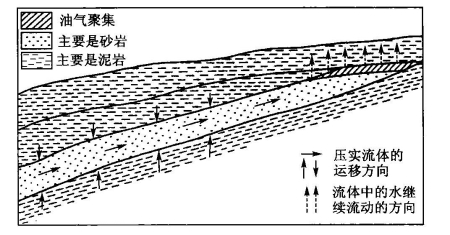 从生油层进入储集层的压实流体,沿着背斜的翼部向顶部运移(图7-11)。在圈闭中,水很可能通过上覆泥岩盖层继续向上流动,而把烃类和一些无机盐类渗留下来在圈闭中聚集,并使圈闭中流体的含盐度增加,pH值降低,这又有利于烃类的进一步聚集。图7-11中所表示的是储集层与烃源岩在大面积上互层接触,而又无不整合和构造破坏的最佳情况。西西伯利亚盆地的侏罗系和白垩系剖面就具有上述条件,这是该地区原油储量极为丰富、仅次于中东地区的重要原因。