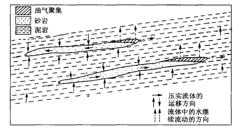 被生油泥岩包围的砂岩透镜体中的油气聚集,是一个复杂的、目前还不十分清楚的过程。它可能是多种动力作用的结果:早期压实流体可以从周围的生油泥岩进入砂岩透镜体,此时虽然含油气不多但却向砂岩体排入大量盐分,如果没有断层或裂缝直接与生油泥岩外的地层相通,则砂泥岩中流体压力很快达到平衡,特别是扁平状砂岩体剩余压差就更小了,后期的压实流体很难进入;此时主要依靠烃浓度差,生油泥岩中的烃类向砂岩体扩散;依靠盐度差,生油泥岩中的水(包括水溶烃)向砂岩体中渗透;还依靠泥-砂界面上的毛细管压力差,将泥岩中的油气排入砂岩体;还可能在生烃膨胀压力作用下,将油气沿干酪根网络(当泥岩有机质含量较高时)排入砂岩体。无论是扩散流,还是渗透流进入砂岩体后,其中油气最终都转变为游离相,再加上直接排入的油气,它们在浮力的作用下占据砂岩体的顶部,同时给水施以附加压力,使其在紧靠烃-水界面的底部排出砂岩体,这样油气将不断富集(图7-14)。可见,如果砂岩体在泥岩中呈竖直状或有与外界相连通的断层存在,则有利于其中油气的聚集。