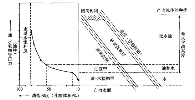 图7-18 含油饱和度与油气藏中流体分布和产出的关系(据Schowalter,1979)