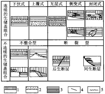1—盖层;2—储集层;3—烃源岩;4—断层;5—不整合