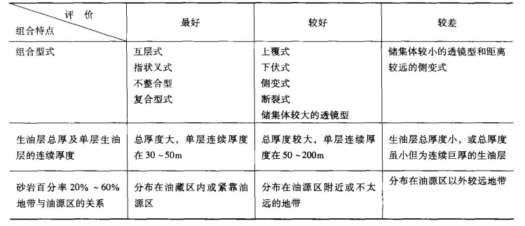 所谓最佳的组合型式,就是输导能力和效率最高的组合型式,表现为生储盖的时空跨距和生运聚作用的连续性。时空跨距是指在一个生储盖组合中,烃源岩层、储集层和盖层彼此在地质时代和空间剖面上的间隔距离。很明显时空跨距越小,油气运移散失的时间和空间就越小,也就越有利于油气的运聚成藏。通常情况下,油气在本层系内的自生自储比跨层系储聚的散失较少,因而成藏条件也较好。一般来说,互层型、侧变型和不整合型是较好的组合;断裂型、上覆和下伏型次之;封闭型组合中因大多数透镜状聚集体的容积较小,一般不能形成巨大的油气聚集。
