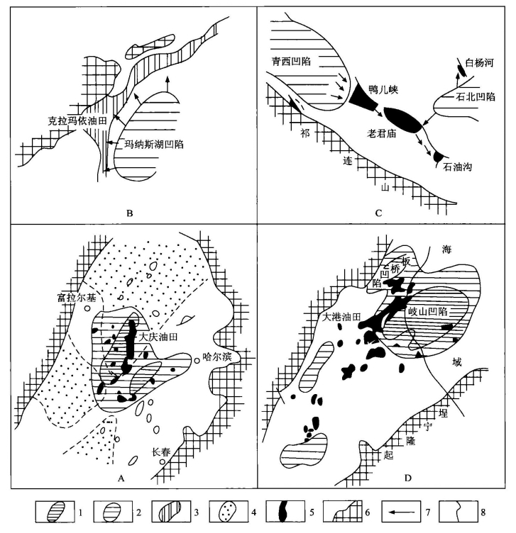 A—松辽盆地;B—准噶尔盆地;C—酒西盆地;D—黄骅坳陷1—生油中心;2—生油凹陷;3—油气聚集带;4—储油岩区;5—油田;6—盆地边界;7—油气运移方向;8—海陆界线