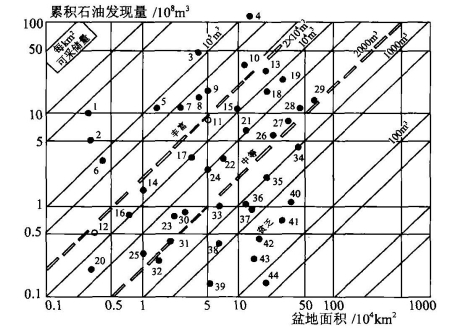图7-20 盆地大小与油气丰度图(据Perodown,1972)