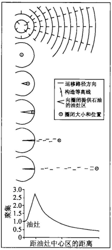 图7-22 位于成烃灶边缘上的圈闭聚集效率示意图(据Hindle,1977)