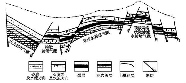 根据这些成藏条件,结合我国实际情况,可将煤层气藏划分为承压水封堵、压力封闭、顶板微渗滤水封堵和构造封闭等四种类型(图7-29),其中以承压水封堵型气藏最为优越,我国沁水盆地环状斜坡带上的石炭、二叠系煤层就属这种类型。