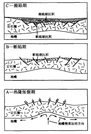 内陆裂谷位于陆壳板块内部,由于地幔物质上涌使岩石圈减薄,在地壳上部产生张性破裂,并逐渐演变成裂谷盆地。由于处于大陆扩张初期,岩石圈并未被拉开,只是当裂陷发育到一定程度时,地幔物质趋于稳定,裂谷的发育也由断陷阶段转化为拗陷阶段(热沉降阶段)(图8-3)。
