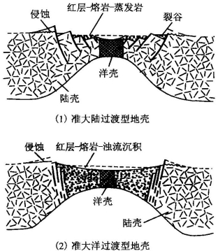 当内陆裂谷进一步拉开、地壳强烈减薄、形成过渡壳时,内陆裂谷就演变成陆间裂谷,当陆壳完全分开时,裂谷轴部可有部分洋壳(图8-6),因此也称为原始大洋裂谷。如果进一步扩张,就形成了洋盆。