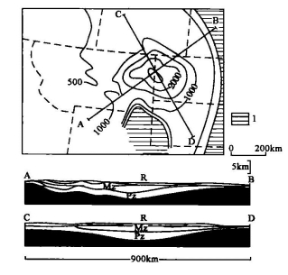 这类盆地位于克拉通内部,平面上呈近圆形,剖面上为碟状(图8-4)。构造一般比较简单,主要为长垣隆起和弯窿。沉积特征是:在剖面的最下部和最上部及局部边缘为非海相地层,中部发育典型的浅海相碳酸盐岩和碎屑岩沉积;沉积厚度可小可大(如美国的伊利诺伊盆地、密执安盆地、威林斯顿盆地等,一般为3000~4000m,而西西伯利亚盆地中新生界就厚达4000~8000m)。其含油气性主要与沉积岩厚度、生油岩及其埋深有关。