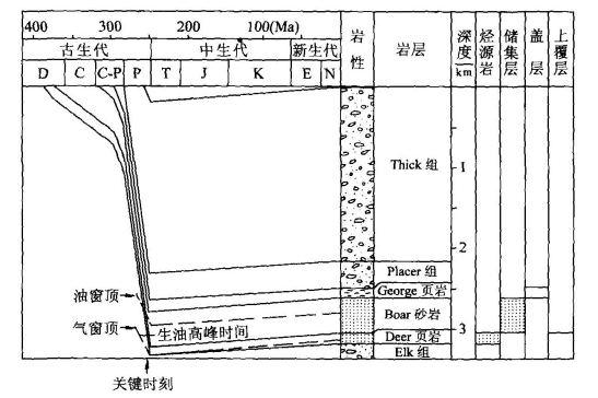 图8-15 泥盆系Deer页岩的埋藏史和该含油气系统的关键时刻(据Magoon & Dow.1994)
