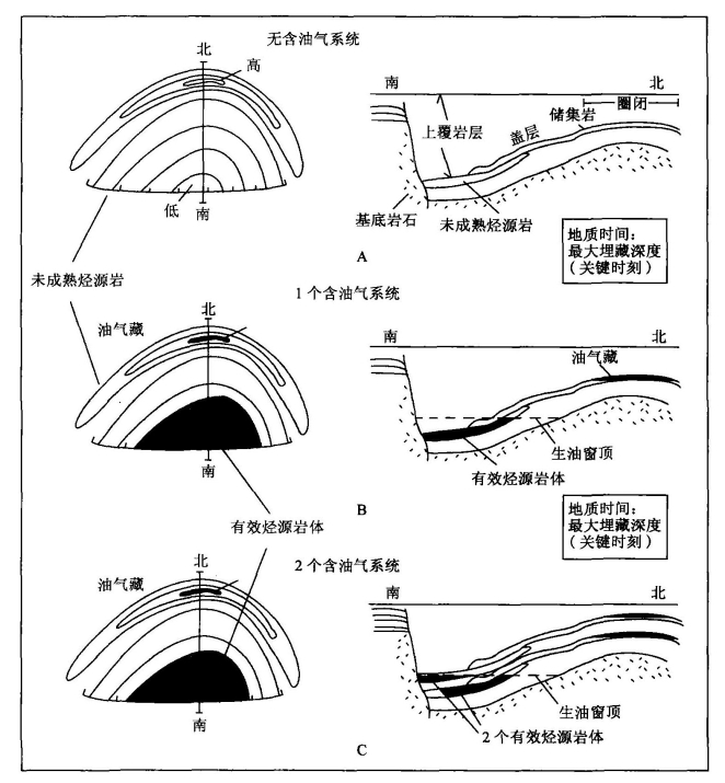 根据上述分析和图件,人们就可以认识含油气系统的地理范围、地层分布和形成年龄。反过来通过作关键时刻的平面范围和地质剖面图,就可以判断含油气系统是否存在及其个数(图8-19)。图中A虽基本要素都存在,但烃源岩尚未成熟,不具有效性,因而没有含油气系统;图中B存在1个含油气系统;图中C有2个含油气系统存在。