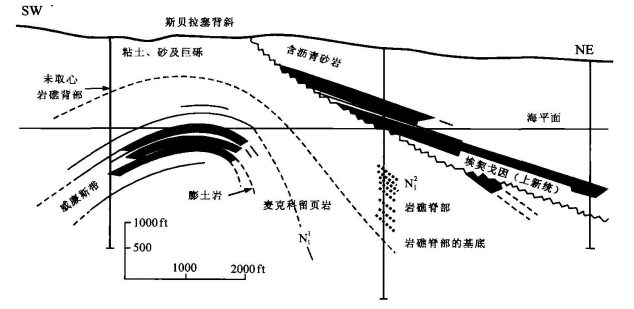 在礁型油气田中,有些深部为礁型油气藏,浅部(礁上方)为礁生长过程形成的同生背斜或压实背斜油气藏,或强烈褶皱背斜中形成的背斜油气藏,这种油气田才称为礁型复合油气田。以美国二叠纪盆地中斯库瑞县的斯奈德-斯克雷礁型复合油气田较为典型(图4-37)。若仅有礁型油气藏,而礁上方没有构造类油气藏,则属于地层型礁型油气田。
