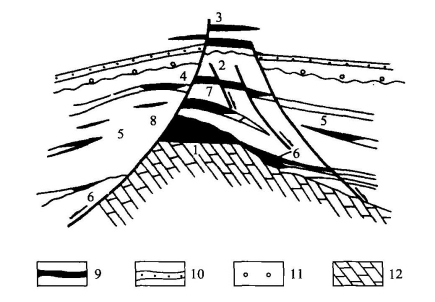 在刺穿的盐(泥)丘油气田中,由于盐核刺穿储油气层,除形成盐核、盐帽遮挡以及盐帽内的透镜体油气藏外,常使储集层断裂、尖灭,甚至削蚀,可形成断层、不整合和岩性等多种油气藏。这是一种典型的复合油气田。半刺穿的还可在盐丘上方形成生长背斜。不论是刺穿还是隐刺穿盐(泥)丘构造,只要存在构造和地层两大类油气藏复合而形成的油气田,都称为盐(泥)丘型复合油气田。如果只在单一构造因素控制下形成多种油气藏,则不能称为复合油气田。