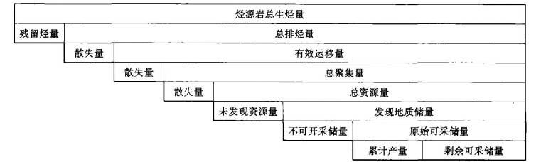 前已述及,油气藏形成过程实质上是油气的散失(耗散)过程,因此,油气资源量既不是油气生成量,也不是目前条件下具有工业价值的可采储量,而是油气生成量减去残留量和油气运移聚集过程中的散失量。同时,油气储量是油气资源量的一部分。油气资源量与油气生成量、储量具有的关系如表8-2。