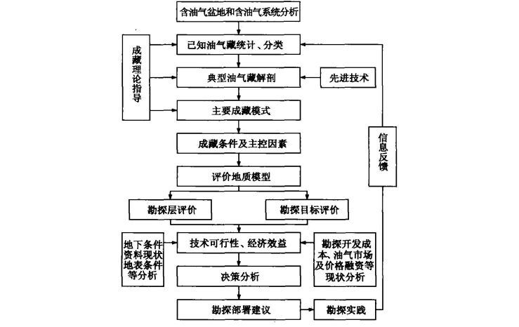 评价的总体思路是以勘探层(Play,也称区带,下同)和勘探目标为基本评价单元,在含油气盆地和含油气系统分析基础上,应用先进成藏理论为指导,先进的技术(甚至包括油藏描述、储层建模及可视化技术)为工具,对典型油气藏进行深入细致的解剖,建立成藏模式并进而建立评价模型,从含油气性(地质风险)和资源量、资源品质诸方面开展资源评价,进而开展勘探开发技术可行性分析和经济效益分析,进行决策分析,筛选有利目标和方案,提出勘探部署建议,该评价结果和建议在经勘探实践检验,并将勘探结果等信息反馈给评价人员,以便及时对评价工作进行修正,改进评价模型,使评价结果逐渐逼近客观实际(图9-2)。