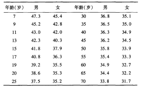 表2-1 我国正常人基础代谢率平均值(千卡/小时/米2)