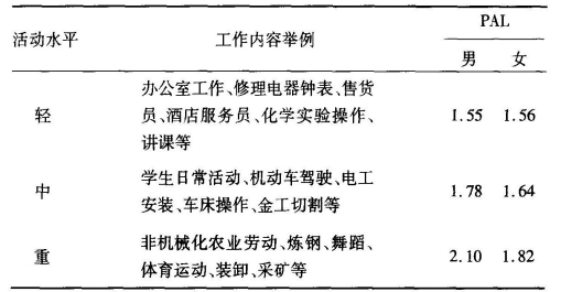 中国营养学会2001年将我国居民活动强度由五级调整为三级:即轻、中、重体力活动,成人能量的推荐摄入量用基础代谢率(BMR)乘以不同的体力活动水平(PAL)系数进行计算(表2-4)。