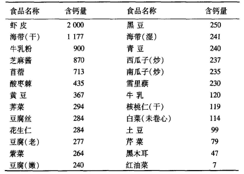 食物中钙的来源以奶与奶类制品最好,不但含量丰富,而且吸收率高,是婴幼儿最理想的钙的来源。蔬菜和豆类含钙也较多。小虾米皮含钙特别丰富(见表4-1)。在儿童及青少年的膳食中加入食用骨粉(含钙>20%,吸收率约70%)亦为膳食中补充钙的有效措施。