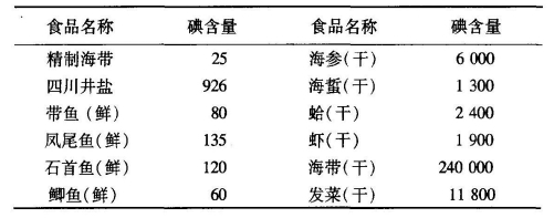 机体所需要的碘可以从饮水、食物及食盐中取得。这些物质中的含碘量主要决定于各地区的生物地质化学状况。一般情况下,远离海洋的内陆山区,其土壤和空气中含碘较少,因而水和食物中的含碘量也不高。碘主要来源于海产食品,如海带、紫菜、海蜇等(见表4-3)。