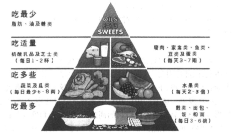 中国营养学会根据我国国民的实际情况拟建了一个居民膳食食物宝塔,分五层:第一层即宝塔底是各种谷类食物。轻体力劳动者每天500克;第二层是蔬菜和水果。一般正常人每天吃400~500克蔬菜、100~200克水果;第三层是鱼、肉、蛋等动物性食物。一般是鱼200克,肉50~100克,蛋20~50克;第四层是奶和牛奶。一般人每天喝250~500毫升;第五层是盐和糖。每天盐的摄取量不超过6克,糖每天摄取也不要太多。