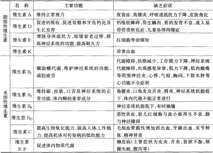 维生素是维持人体生命和正常机能不可缺少的一种营养素。它的种类很多,目前已知的有三十多种,分为两类:一类是脂溶性维生素,主要有维生素A、D、E、K;另一类是水溶性维生素,主要有维生素B1、B2、C及维生素P.P等。各种维生素在体内有其特殊的功能,总的来说都有调节物质代谢,保证生理功能正常的作用,它们不是构成组织的原料,也不供给热能。各种维生素的功能如表3-1所示: