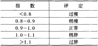 指数=体重(千克)/[身高(厘米)-100](表3-3)