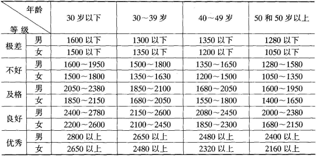 通过测定某人在12分钟内跑的距离来评定健康情况。美国库柏制定的标准现已被我国所采用(表3-9)。