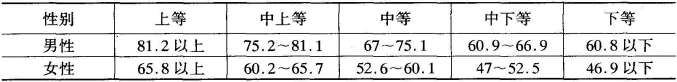 表3-2为1995年全国30个省、自治区、直辖市汉族学生身高调研数据。在进行自我评价时按照上表数据进行对照。根据1997年中国成年人体质监测公报,我国成年男子平均身高为169.20厘米,平均体重为66.5公斤。成年女子平均身高为158.60厘米,平均体重为56.8公斤(《体育科学》1999年第19卷)。