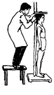 测量身高的方法是(图3-1):受测者赤脚,以立正姿势(躯干挺直,上肢自然下垂,足跟并拢,足尖分开成60。站在身高计的底板上,头部正直,两眼平视,足跟、骶骨及两肩胛间与立柱接触。协助者站在受测试者右侧,调整受测试者头部,使其耳廓上缘与眼眶下缘最低点保持在统一水平线上,然后下移水平板,轻压在受测试者头部,读数并记录。记录以厘米为单位,测量误差不得超过0.5厘米(一种简易的方法为:先用卷尺在墙上标上刻度,然后受测者赤脚靠墙站立,用一本精装书当直角尺)。