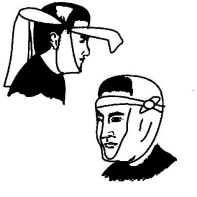 (2)头顶、耳部、下颌受伤时,把三角巾折成四折由下颌向头顶(或头顶向下颌)绕,在额侧交叉向前额、后脑缠绕包扎,如图4-10。