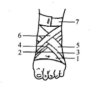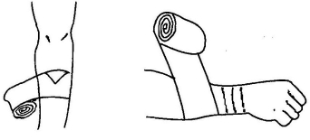 包扎时将绷带绕肢体包扎,绕第二圈时把绷带头一小角反折,使第二圈压住带头,然后继续绕圈,根据出血情况决定包扎圈数。适用于损伤面积小,肢体粗细均匀,如前臂近手腕处、小腿近踝关节、额头等部位,如图4-7。