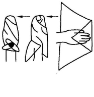 (1)手出现大面积损伤时,使三角巾大角与手指方向一致,然后反折大角,再把两小角交叉重叠包扎,如图4-9。