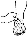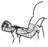 (4)肱动脉止血法:在肱二头肌内缘中点,将臂微外展,用大拇指将动脉压在肱骨上。此法适用于前臂和手出血,如图4-4。