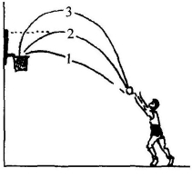 投篮时,球飞行的抛物线,应既便于控制球的路线,又适合命中篮的角度为原则,如图5-3。
