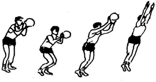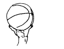(1)原地双手投篮:如图5-4。两脚左右或前后开立,约与肩同宽,两膝弯曲,重心下降,上体稍前倾,重心落在两脚前脚掌上,两肘关节自然下垂于体侧,双手持球于胸前或头上方,眼睛注视瞄准点。投篮时两脚蹬地,腰胯伸展。当两臂向前上方将要伸直时两拇指向前压送,两手腕外翻,使球最后经食指的指尖投出。球出手后,腿、腰、臂自然伸直。为了提高出手高度,可持球于头上方投篮。