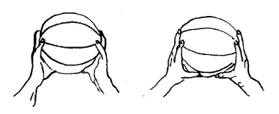 (2)双手投篮手法:如图5-2。双手持球,手指自然分开,两拇指呈八字形,手心空出,手腕放松。球出手时,手臂前伸,全身协调用力,手掌外翻,球从两手中、食指出手。