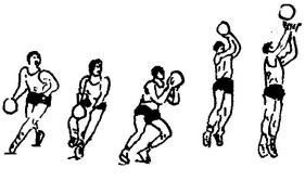 (4)行进间单手投篮:如图5-7。行进间投篮多用于快攻结束或切入篮下投篮,俗称跑篮。以右手为例,右脚向前跨大步时双手持球,右脚落地后,左脚向前跨一小步蹬地起跳,右腿提膝,双手迅速举球于右肩上方,右手托球,掌心向上,左手扶球,当身体腾空接近最高点时,右臂和身体充分向上伸展,用手腕和手指的力量将球投出。