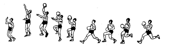 (3)跳投:准备动作与单手投篮基本一样,如图5-6。起跳时,起跳和举球的动作要协调一致。垂直跳起时,用腰腹力量保持身体平衡,同时迅速举球于头侧上方。当身体腾空到最高点(停身的一瞬)或接近最高点时,迅速伸臂,用手腕和手指的合力将球投出(出手动作与原地单手投篮相同)。