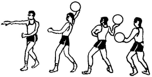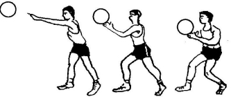 以右手为例,双手持球于胸前,两脚开立,传球时,左脚向传球方向上半步,同时将球引到肩上方。单手持球,手腕后屈,身体稍向右转,右脚蹬地转体带动手臂迅速向前挥动,利用臂、腕和手指的力量将球传出,如传球距离较远,可加大动作幅度(图5-11)。